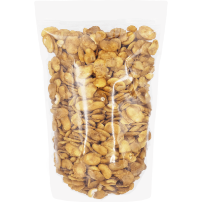 Bób Prażony o smaku miodu i musztardy jest idealny jako przekąska w ciągu dnia, dodatek do sałatek lub jako chrupiący element przekąsek na imprezach.