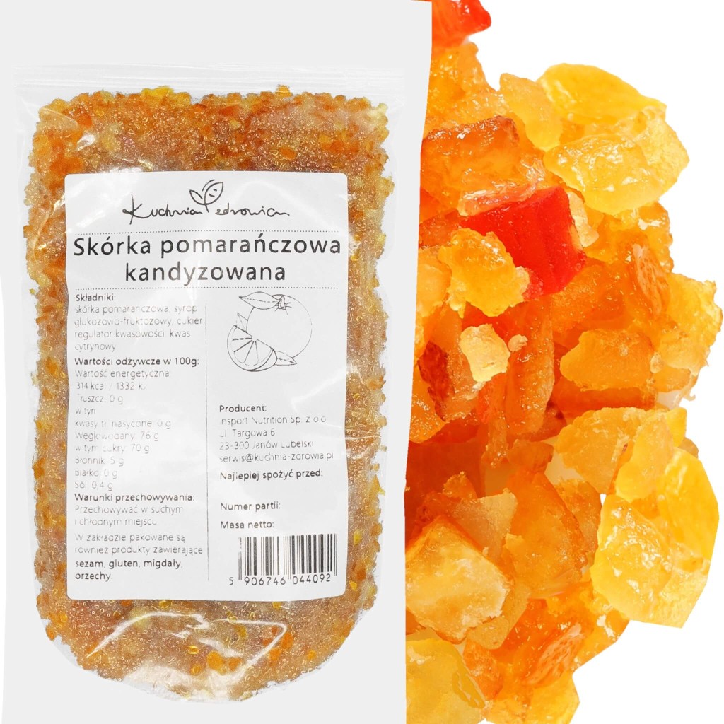 Skórka pomarańczowa kandyzowana to wyjątkowy i aromatyczny produkt, będący połączeniem intensywnego smaku i zapachu pomarańczy z delikatną słodyczą procesu kandyzowania. Produkcja skórki pomarańczowej kandyzowanej rozpoczyna się od starannego wyboru dojrzałych, soczystych pomarańczy. Skórka jest następnie oddzielana od miąższu, starając się zachować jak najwięcej białej, gąbczastej warstwy (albedo), która jest bogata w pektyny i naturalne aromaty. Po usunięciu nadmiaru goryczki przez blanszowanie w wodzie, skórka jest gotowana w syropie cukrowym. Proces ten pozwala na stopniowe wnikanie cukru do skórki, nadając jej słodki smak i przyjemną konsystencję.