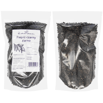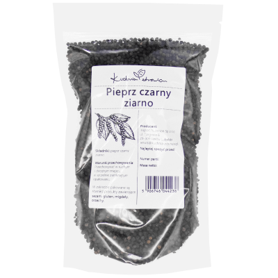 Pieprz czarny w ziarnach to jedna z najbardziej uniwersalnych i powszechnie używanych przypraw na świecie, pochodząca z wysuszonych owoców rośliny Piper nigrum, która jest uprawiana w klimacie tropikalnym. Pieprz czarny charakteryzuje się ostrym, pikantnym smakiem i aromatem, który może wzbogacić niemal każdą potrawę, a jego uniwersalność sprawia, że jest obecny w kuchniach na całym świecie. Stosowany jest zarówno w całości, jak i w postaci zmielonej bezpośrednio przed spożyciem, aby zachować jego pełnię smaku i aromatu.
