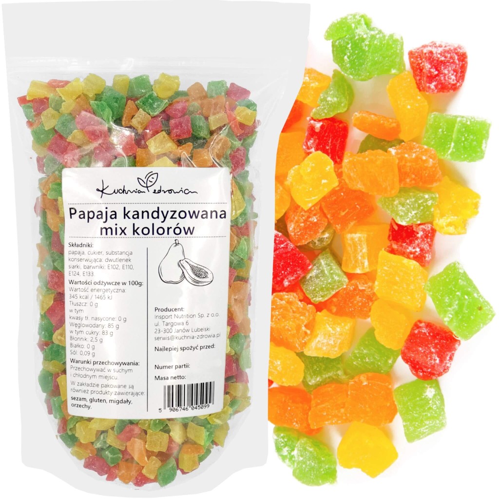 Składniki: papaja, cukier, substancja konserwująca: dwutlenek siarki, barwniki: E102, E110, E124, E133