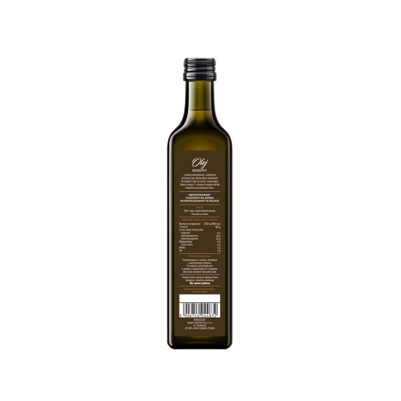 Przechowywanie: Przechowywać w suchym, chłodnym i zaciemnionym miejscu. Po otwarciu przechowywać w lodówce maksymalnie 3-4 tygodnie. Olej może zawierać naturalny osad.