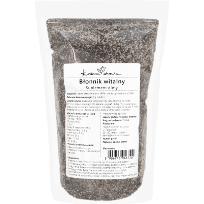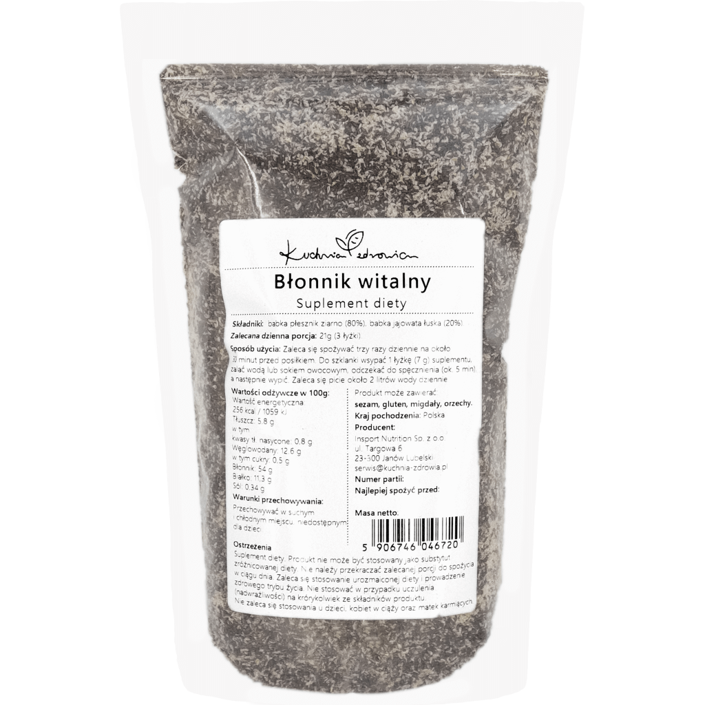 Błonnik witalny to naturalny suplement diety, który składa się z ziaren babki płesznik (80%) oraz łusek babki jajowatej (20%). Dzięki wysokiej zawartości błonnika wspomaga prawidłowe funkcjonowanie układu pokarmowego, regulując pracę jelit oraz pomagając w utrzymaniu uczucia sytości. Jest łatwy do włączenia do codziennej diety, wzbogacając potrawy o wartości odżywcze, które wspierają zdrowie i samopoczucie.