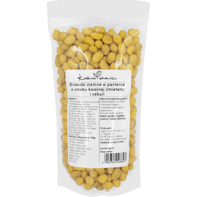 Orzeszki ziemne w panierce o smaku kwaśnej śmietany i cebuli to wyjątkowa przekąska o intensywnym smaku i chrupiącej konsystencji. Połączenie delikatnej kwaśnej śmietany i aromatycznej cebuli nadaje im wyrazisty charakter, idealny do podjadania podczas spotkań towarzyskich czy relaksu przy filmie. Każdy orzeszek jest starannie obtoczony, tworząc wyjątkowe doświadczenie smakowe.