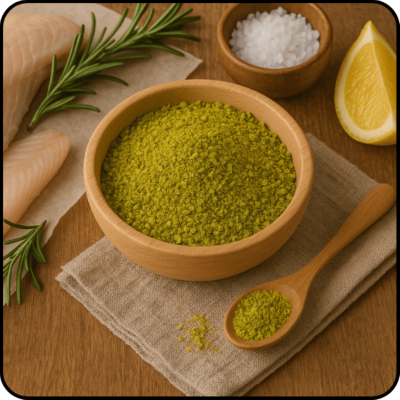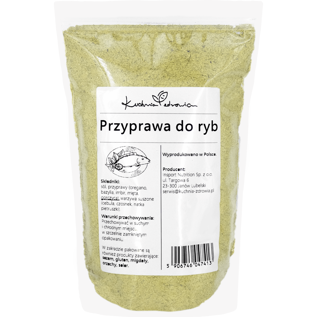 ✔️ Produkt zawiera sól, dlatego warto ograniczyć jej dodatkowe dosalanie. Jeśli potrzebujesz jeszcze mniej sodu, posyp rybę cieńszą warstwą mieszanki lub zmieszaj przyprawę z cytryną i świeżymi ziołami, aby zmniejszyć łączną ilość soli w daniu.
