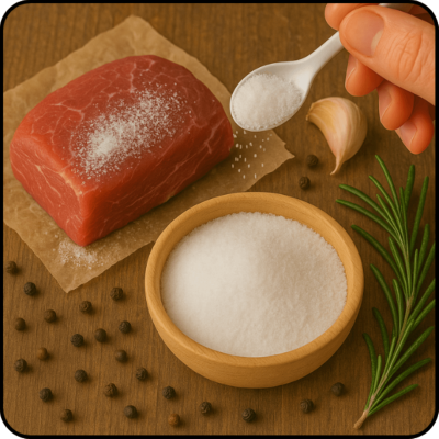 ✔️ Przy peklowaniu na sucho stosuje się zazwyczaj 18–25 g Peklosoli na 1 kg mięsa. W solankach mokrych zaleca się 30–40 g Peklosoli na 1 litr wody, co zapewnia równomierne przesolenie i prawidłową zawartość azotynu.