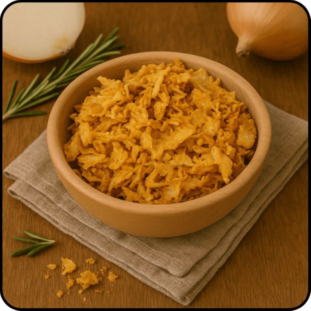 ✔️Kawałki cebuli są delikatnie prażone w niewielkiej ilości oleju rzepakowego, co pozwala uzyskać złocisty kolor i głęboki smak bez nadmiernego nasiąkania tłuszczem.