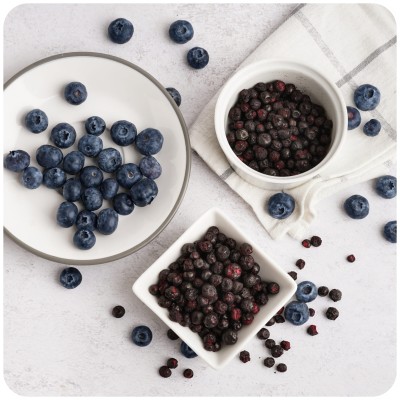 Borówka amerykańska liofilizowana (100 g) - to wygodny składnik do kuchni, który łączy intensywny owocowy smak z przyjemną chrupkością. Po otwarciu opakowania wyczuwalny jest wyraźny aromat borówki, a forma liofilizowana sprawia, że owoce są zawsze pod ręką - bez mycia, bez rozmrażania i bez ryzyka marnowania świeżych owoców. To prosty sposób, aby szybko podnieść jakość śniadań, deserów i wypieków, nawet gdy masz mało czasu.
