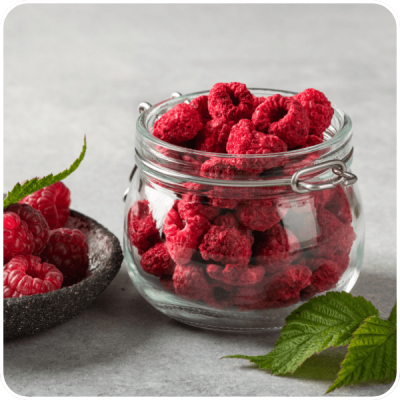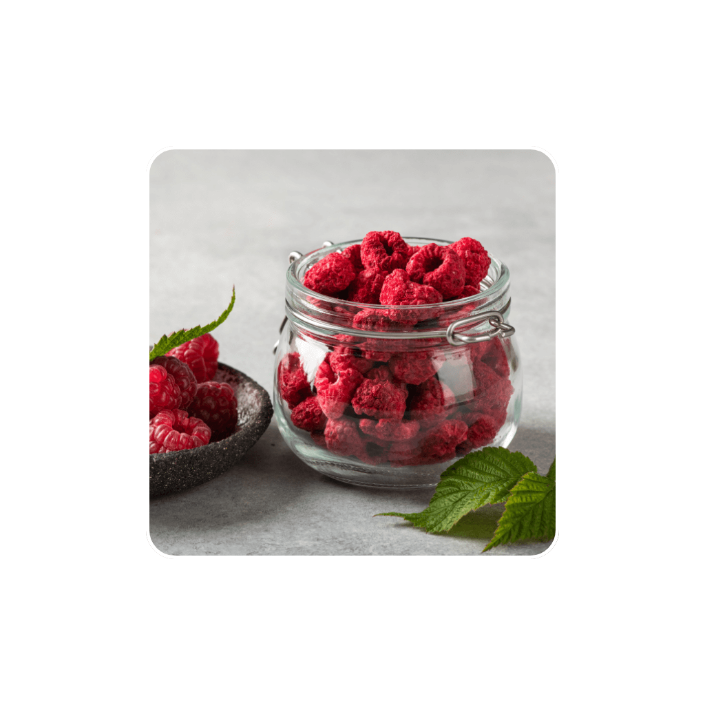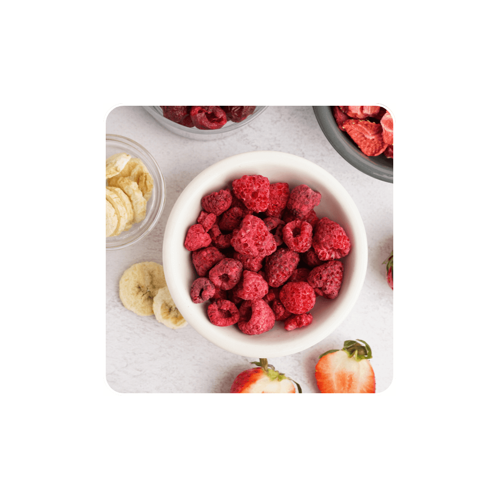 Liofilizacja polega na usunięciu wody z owoców w niskiej temperaturze. W odróżnieniu od tradycyjnego suszenia nie opiera się na wysokiej temperaturze, dlatego smak malin pozostaje wyraźny, a struktura staje się lekka i chrupiąca. To przekłada się na konkretny efekt: maliny nie są tylko dodatkiem „dla koloru”, ale realnie podkręcają smak i teksturę gotowego dania.