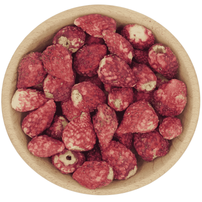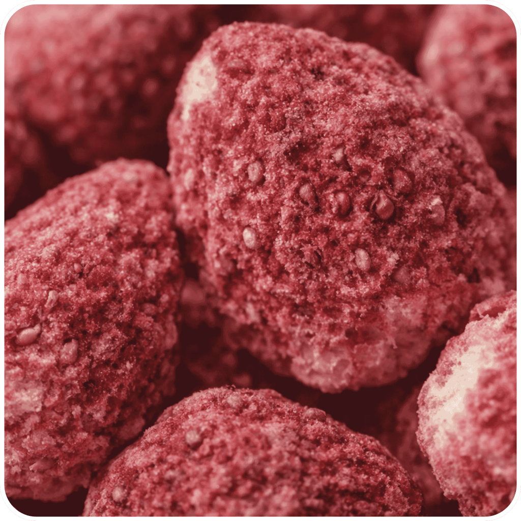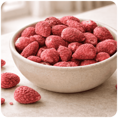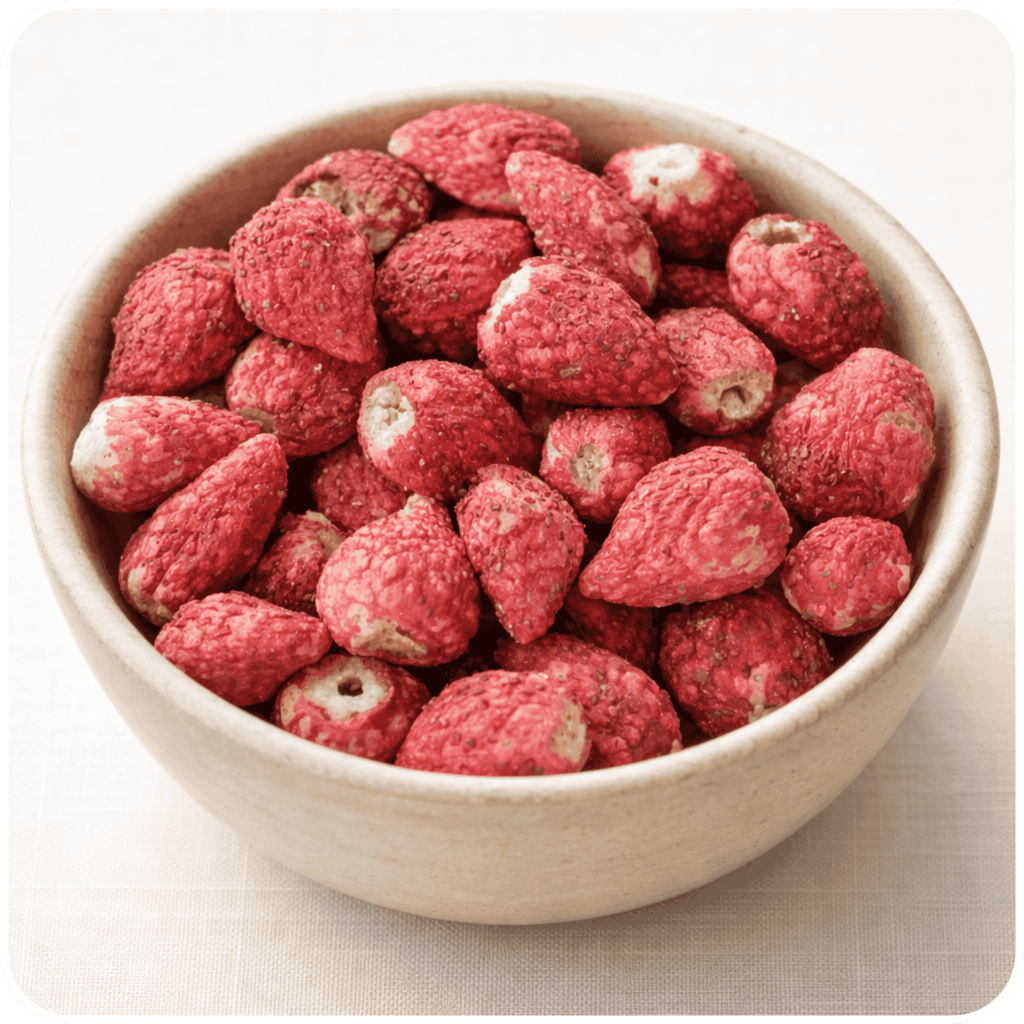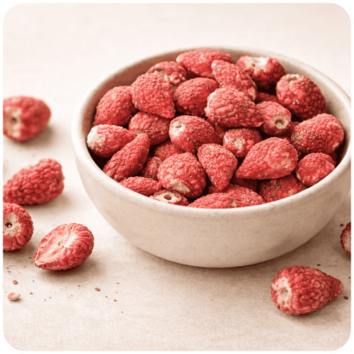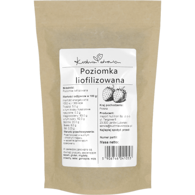 Liofilizacja polega na usunięciu wody z owoców w niskiej temperaturze. W odróżnieniu od tradycyjnego suszenia nie opiera się na wysokiej temperaturze, dlatego smak poziomek pozostaje wyraźny, a struktura staje się lekka i chrupiąca. To przekłada się na konkretny efekt: poziomki nie są tylko dodatkiem „dla koloru”, ale realnie podkręcają smak i teksturę gotowego dania.