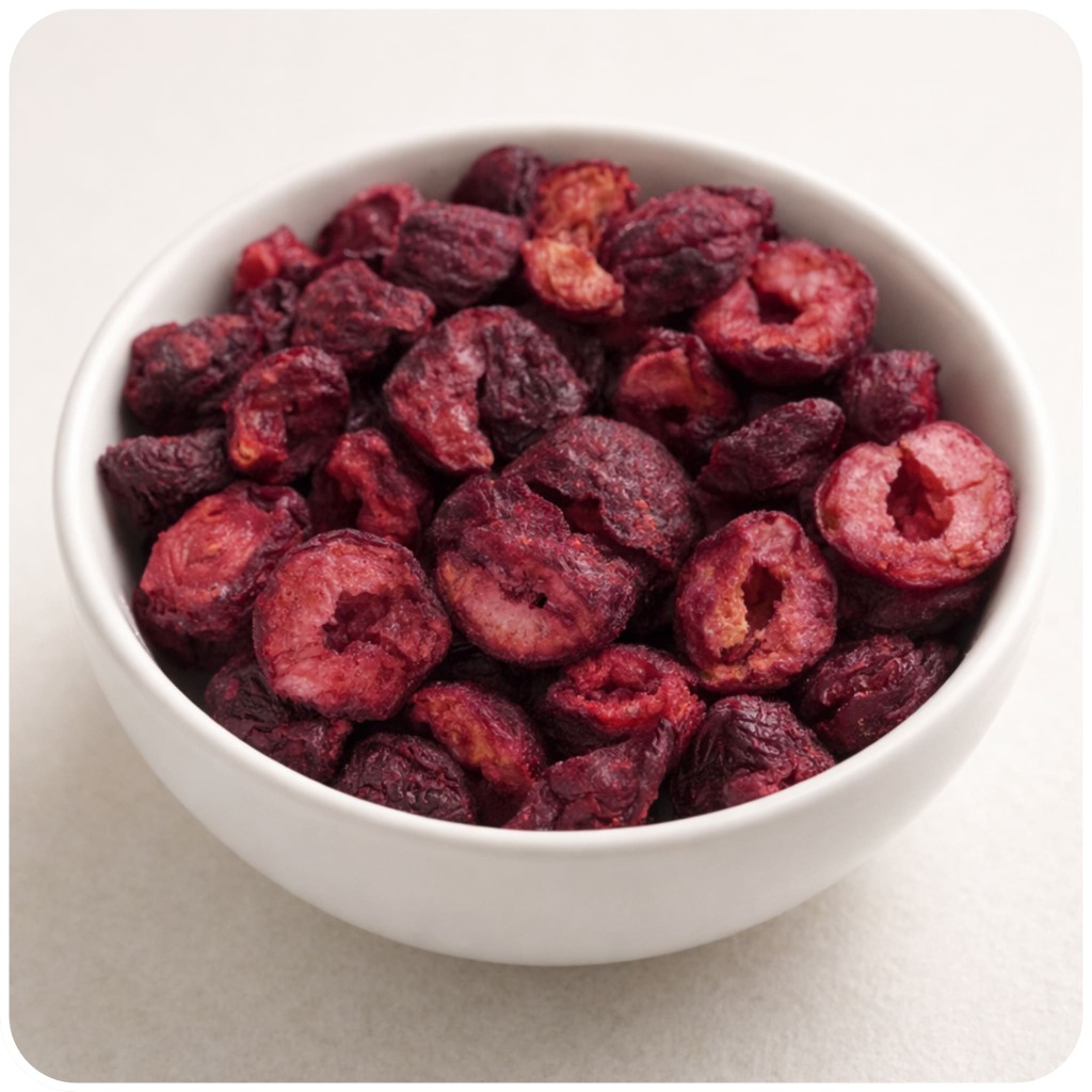 Liofilizacja polega na usunięciu wody z owoców w niskiej temperaturze. W odróżnieniu od tradycyjnego suszenia nie opiera się na wysokiej temperaturze, dlatego smak wiśni pozostaje wyraźny, a struktura staje się lekka i chrupiąca. To przekłada się na konkretny efekt: wiśnie nie są tylko dodatkiem „dla koloru”, ale realnie podkręcają smak i teksturę gotowego dania.